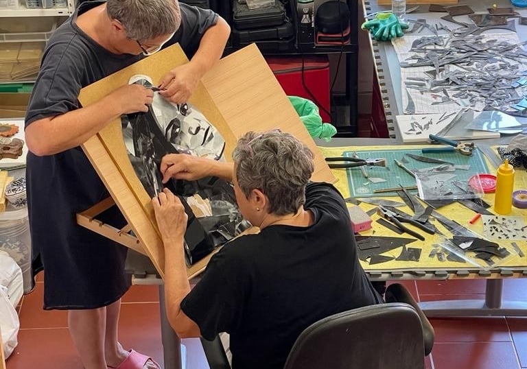 O Processo: Tudo começa com a criação dos desenhos e o corte das bases em madeira. Depois começamos a alicatar vidros e cerâmicas para dar forma aos desenhos. Segue-se a colagem, 1ª secagem, o betume, 2ª secagem, lixa e finalização.
